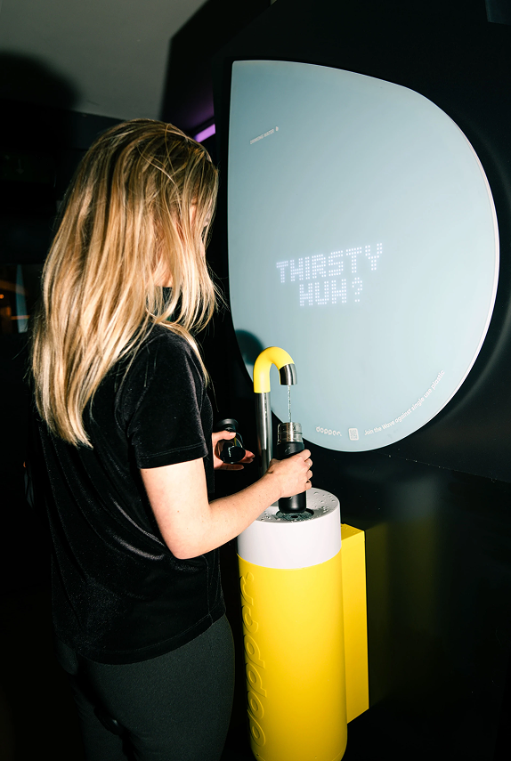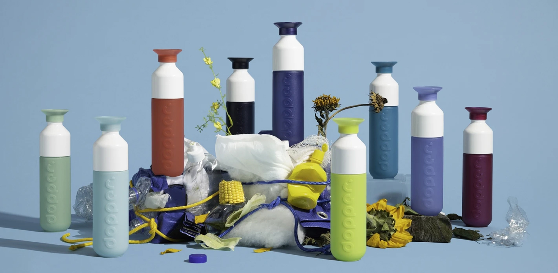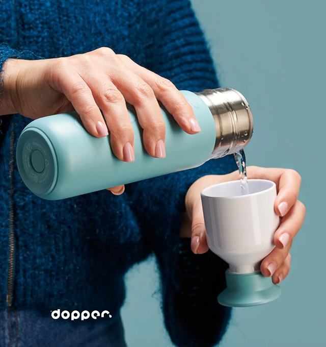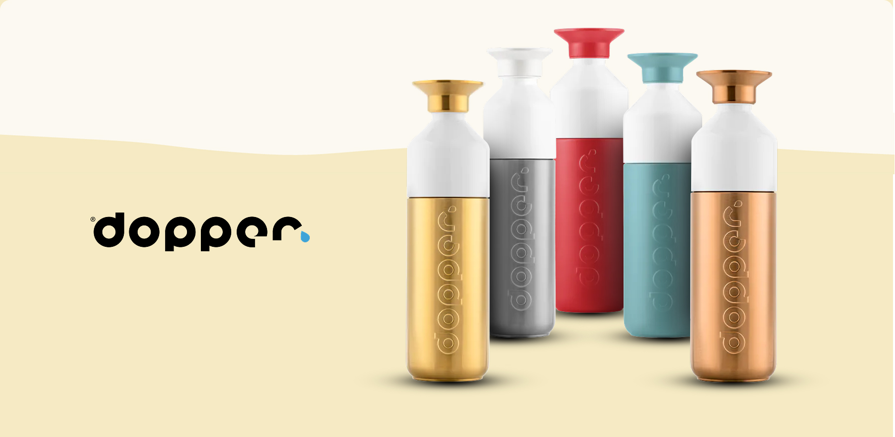 - Interactive elements guide users through Dopper’s sustainability goals and product impact.